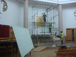 The scaffolding had to be left in place for a week while there was a delay in mounting the left-hand half of the cross. However, on Thursday, 13 March, the final piece was put in place and the scaffolding removed to reveal the bright new cross.